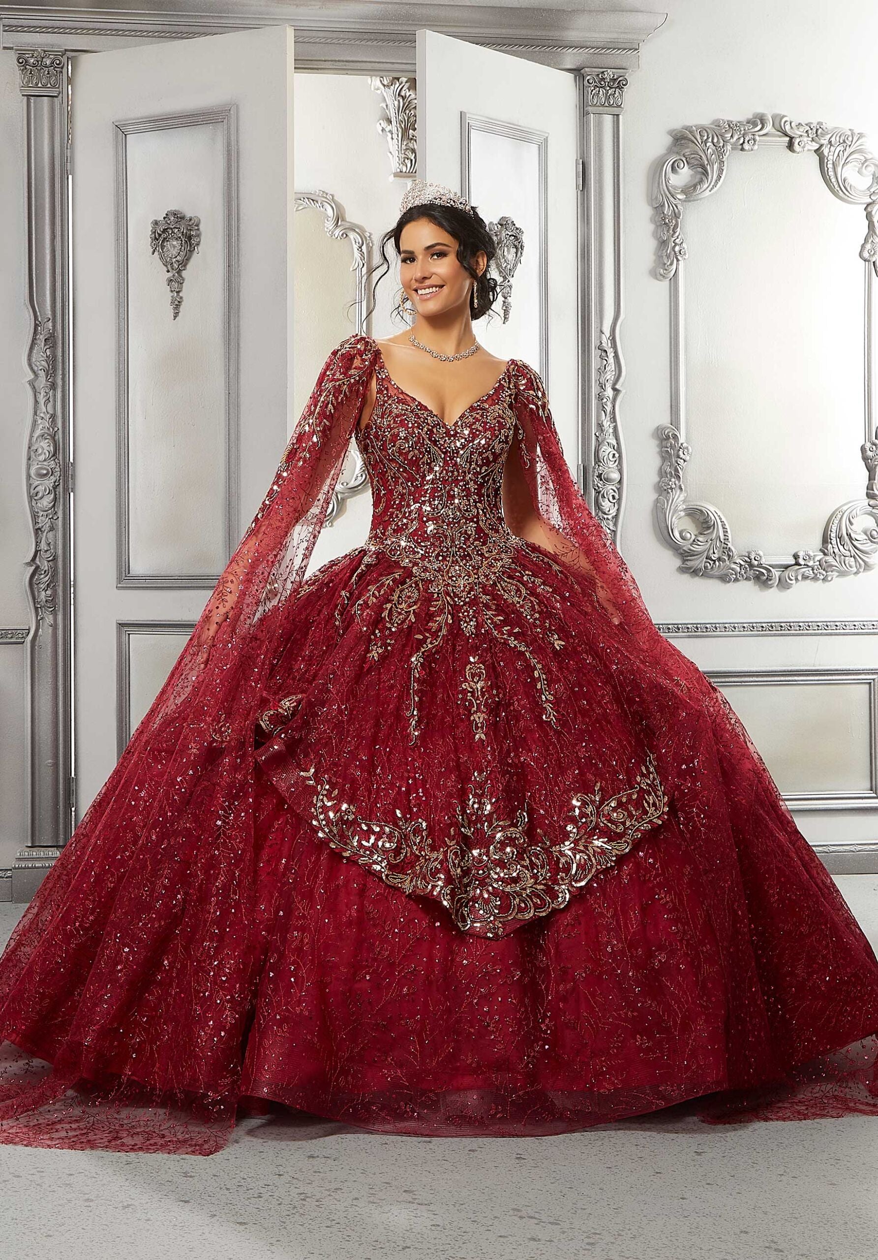 Glamorous quinceañera ball gown featuring glistening sequined embroidered appliqués, accented by sparkling rhinestone and crystal beading, on glitter net. The...